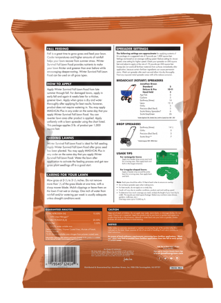 Jonathan Green Winter Survival Fall Lawn Food is the ideal fall lawn fertilizer to spread anytime from early September through mid-November because air temperatures are cooler and the soil is still warm enough for grass roots to grow deep. Winter Survival provides the nutrients to help boost newly seeded lawns as well as help established lawns grow thicker and greener grass with deeper roots.